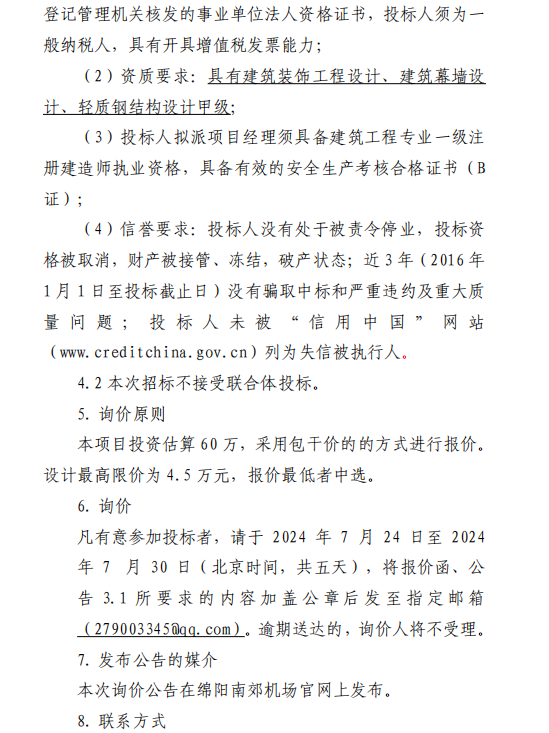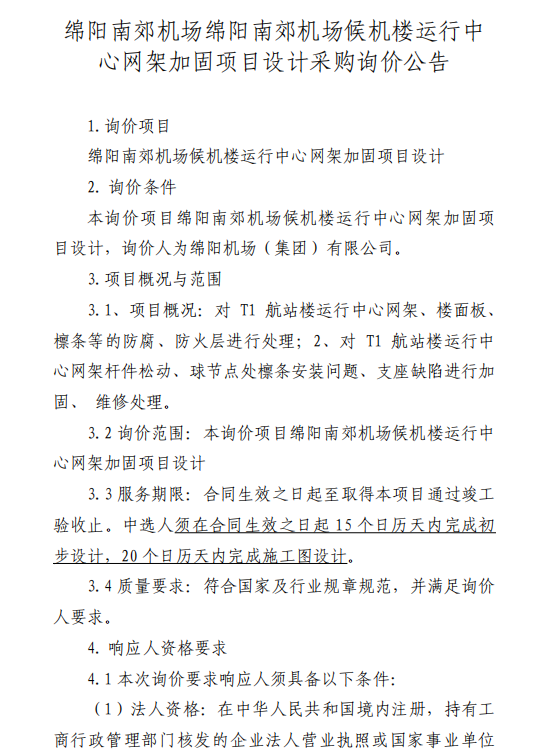 綿陽南郊機(jī)場綿陽南郊機(jī)場候機(jī)樓運(yùn)行中心網(wǎng)架加固項(xiàng)目設(shè)計(jì)采購詢價(jià)公告