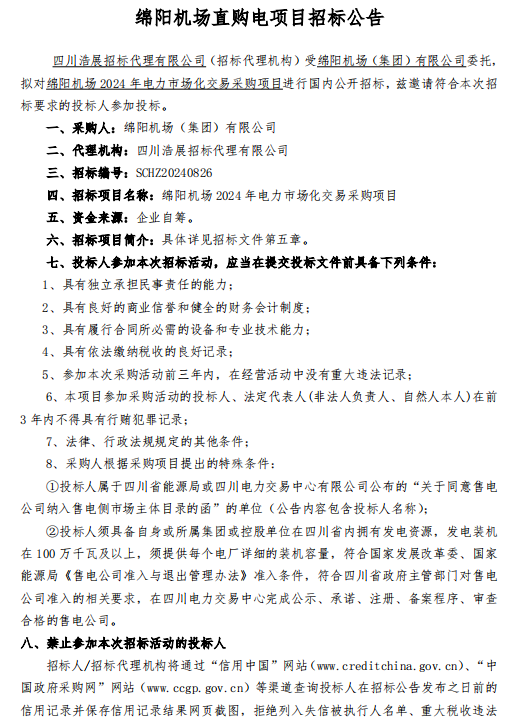 綿陽機(jī)場(chǎng)直購(gòu)電項(xiàng)目招標(biāo)公告